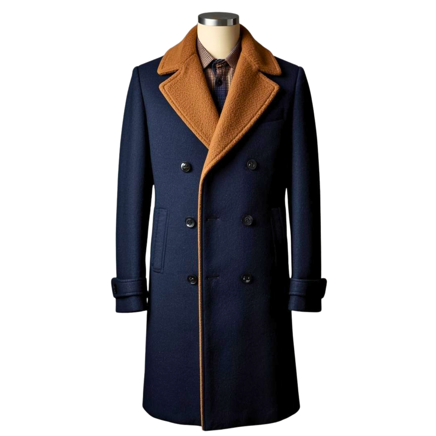 Elevate your winter collection with our Statement Series Navy & Camel Overcoat. Designed for the bold, fashion-forward gentleman, this coat combines a deep navy blue body with a striking camel-colored collar and lapel, creating an instant visual hook for window displays and online catalogs.