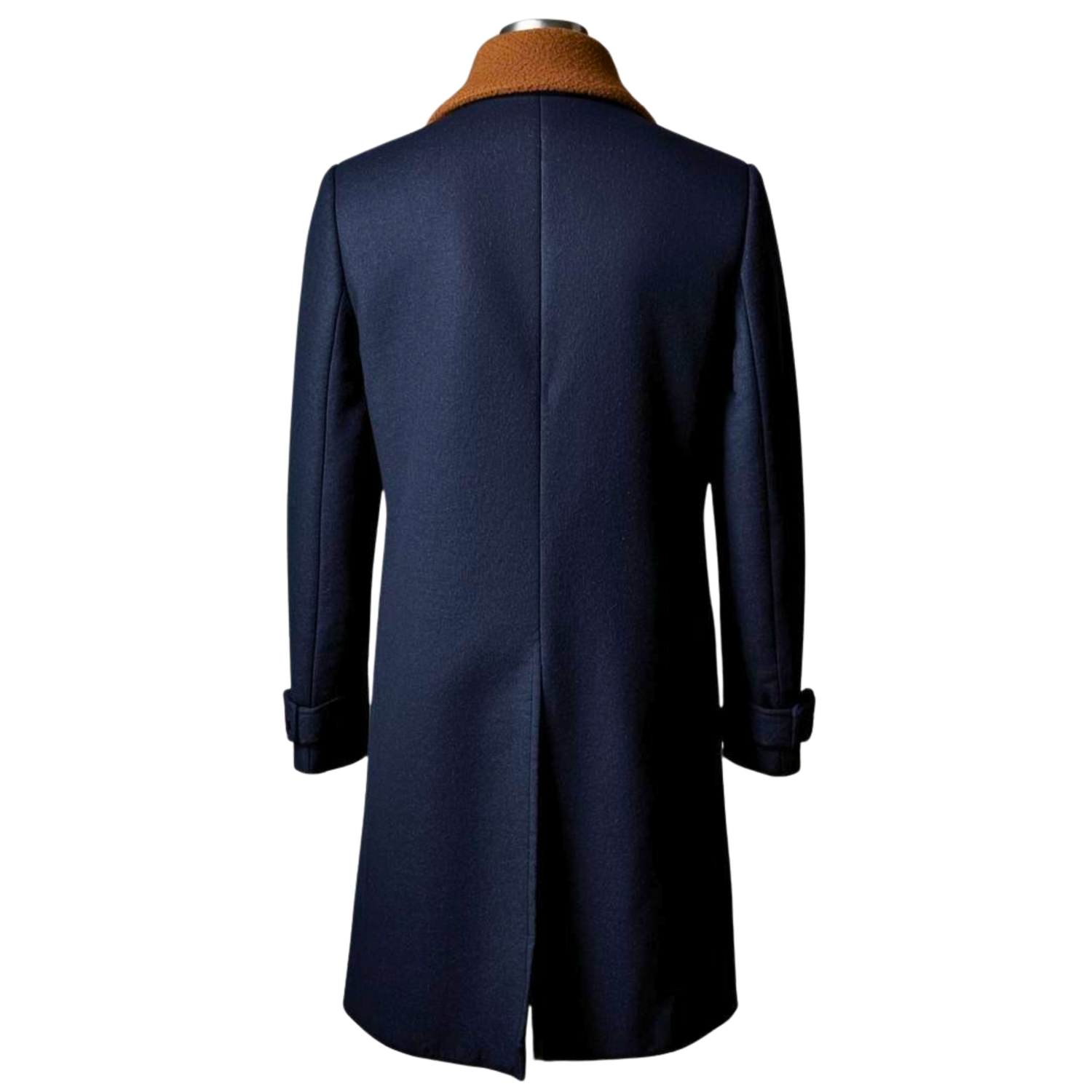 A luxury Navy Blue Double-Breasted Overcoat defined by its bold Camel contrast lapels and collar. Tailored from heavyweight wool blend fabric, this statement piece features vertical welt pockets, cuff straps, and a single rear vent. A sophisticated choice for high-end B2B inventories seeking unique, two-tone outerwear.