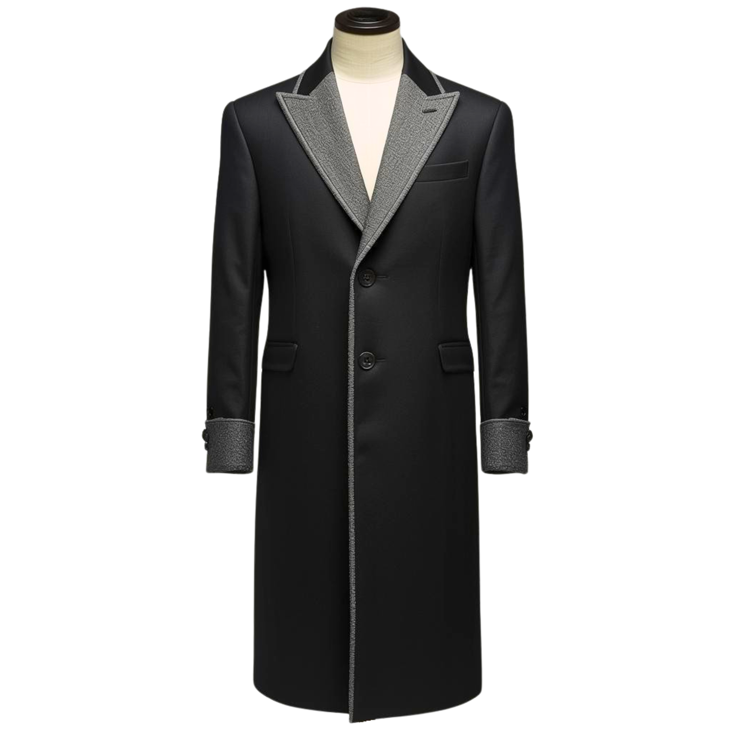 A distinguished Men’s Formal Black Overcoat featuring grey textured contrast details. Designed with peak lapels, turn-back cuffs, and edge piping, this single-breasted coat offers a luxurious, tuxedo-inspired aesthetic. A top-tier choice for retailers focusing on evening wear and special occasion outerwear.