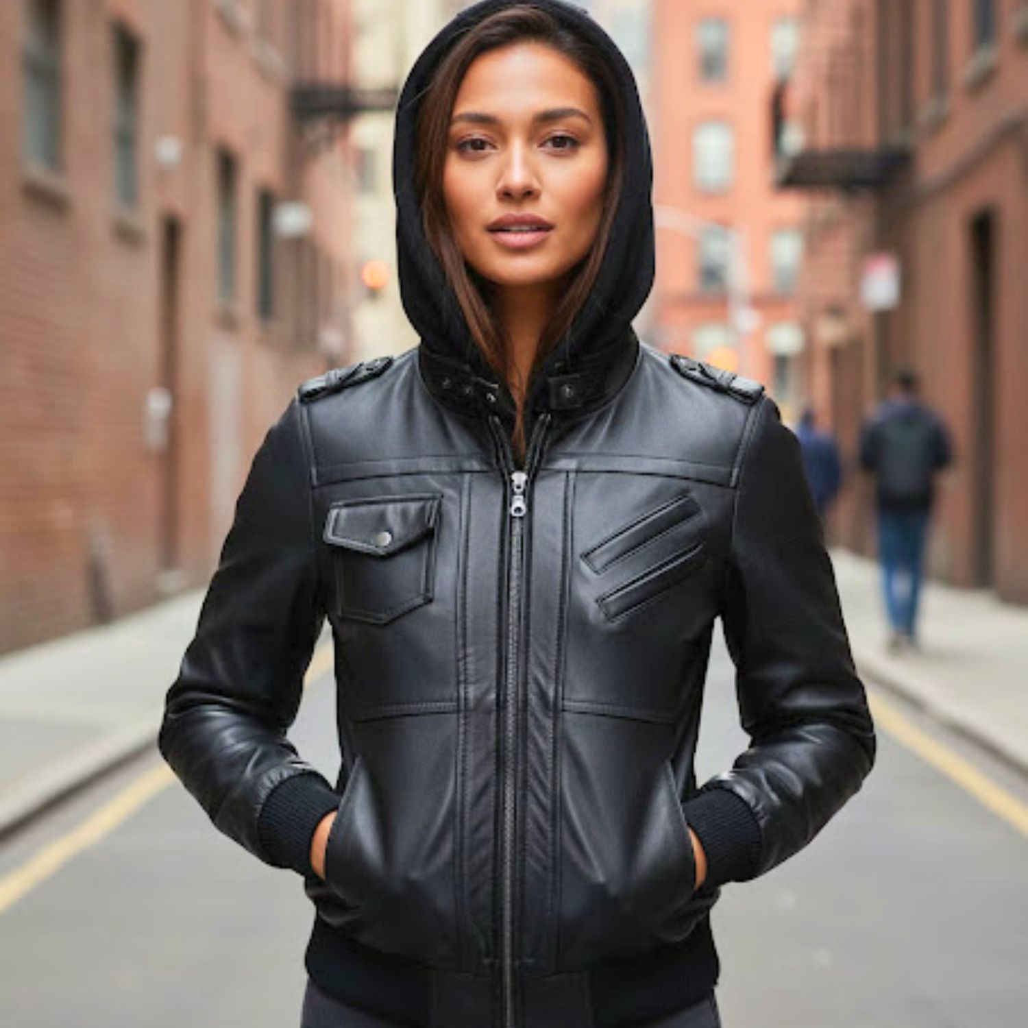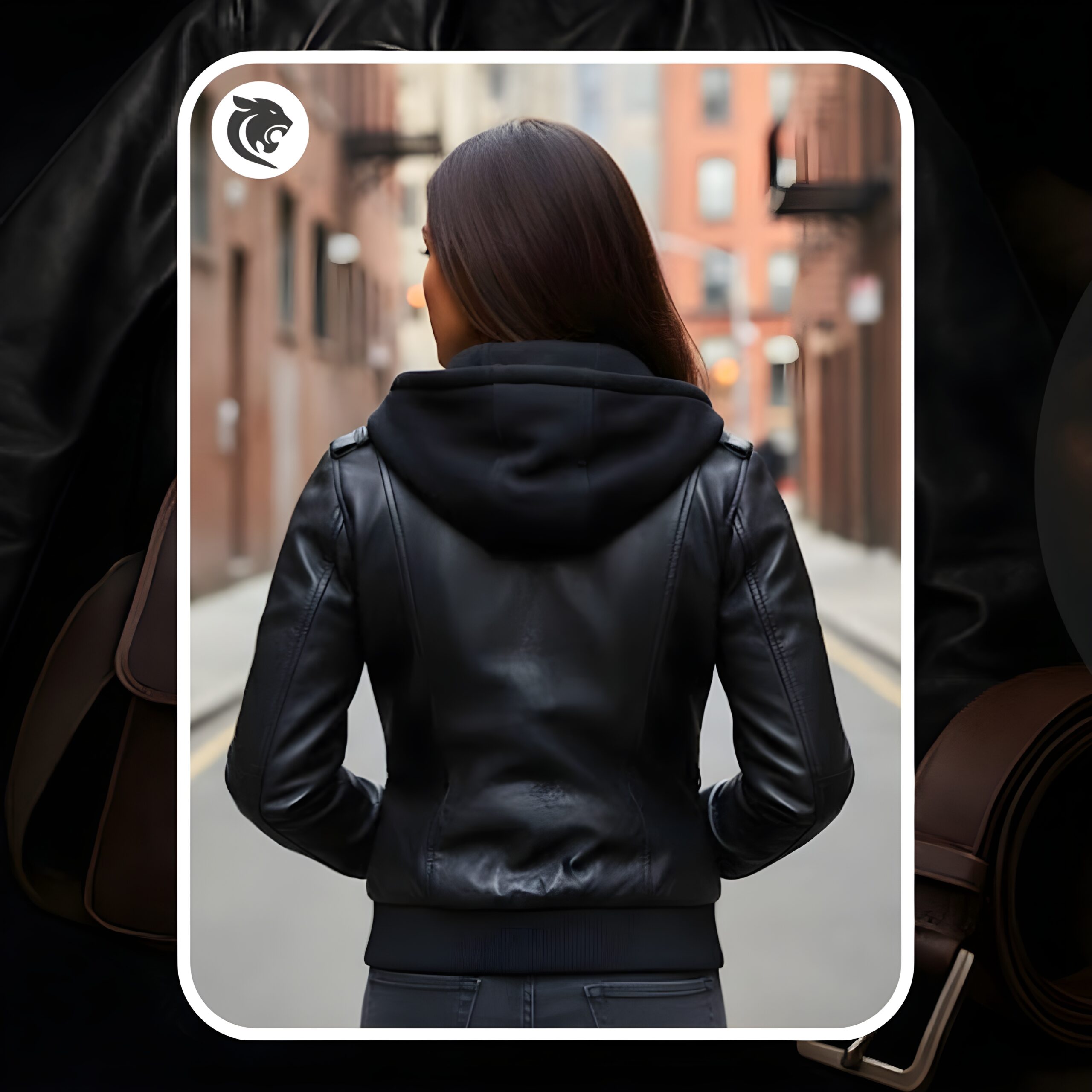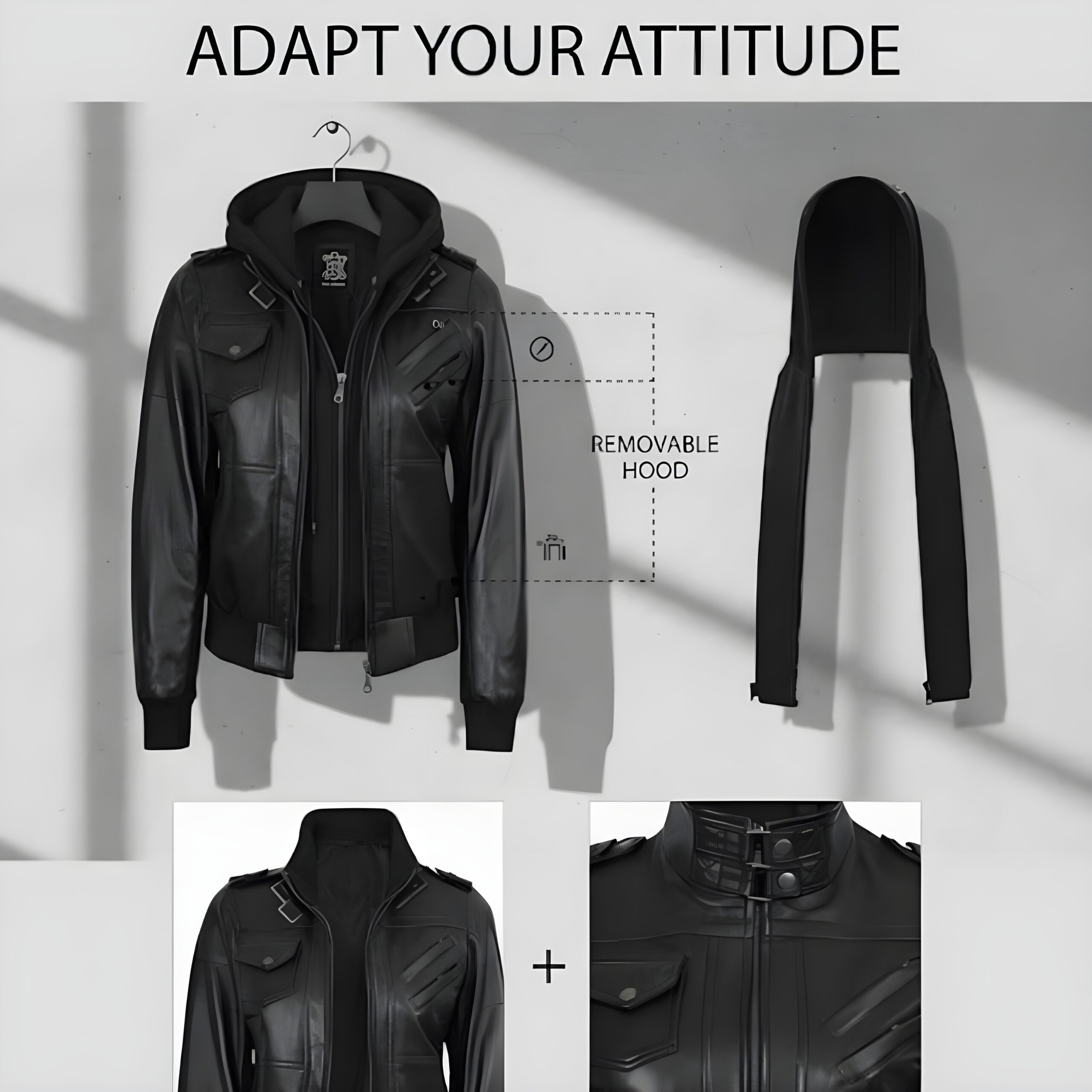 This premium women’s leather jacket from Pelnoir is engineered for customers who expect adaptability, performance, and a luxury finish. Designed as a modern hybrid between a biker coat and a bomber silhouette, this piece delivers elevated versatility with its fully detachable hood and removable scarf-style insert. Whether worn rugged, sleek, or street-ready, Pelnoir ensures a high-value outerwear solution that transitions seamlessly across all environments.