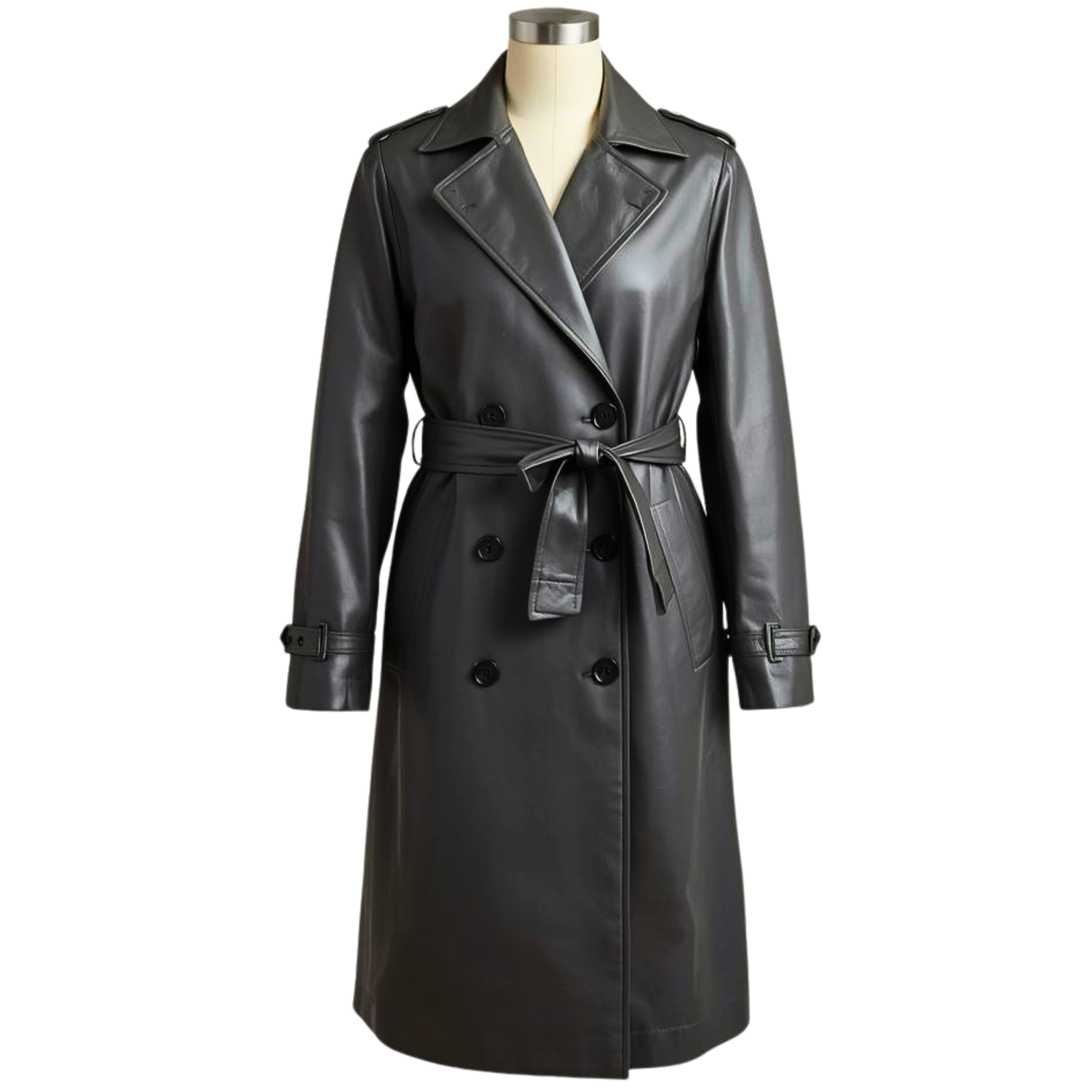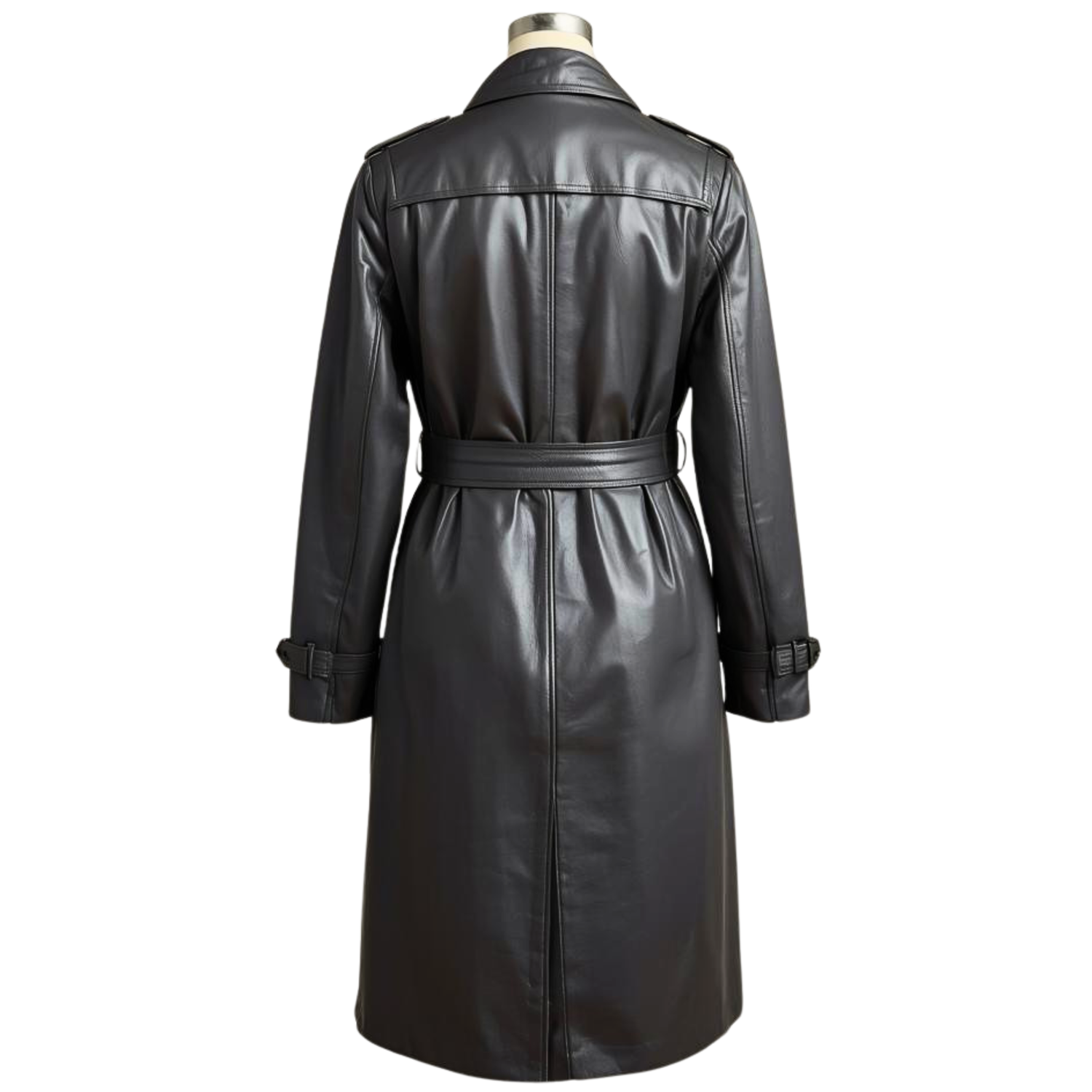 Style: Full-length or mid-calf leather coat, often with a clean, unembellished design and a simple tie belt.