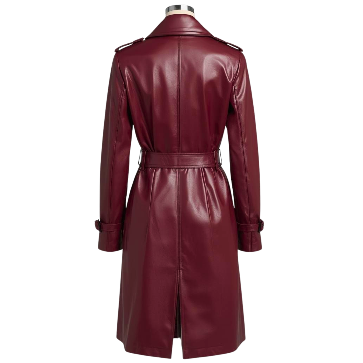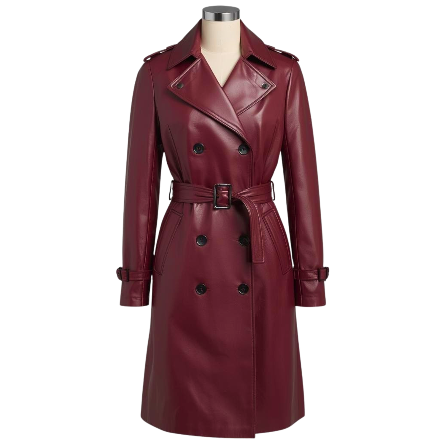Available in two sophisticated hues—Deep Burgundy and Slate Grey—this coat is engineered from high-performance leather that provides a soft-matte finish and exceptional durability. The structured design features a notched lapel, traditional shoulder epaulettes, and a waist-cinching belt, making it a versatile staple for professional environments and luxury lifestyles.